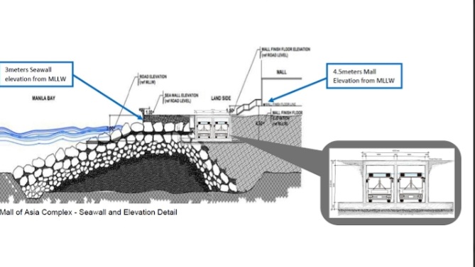The SM Mall of Asia Complex features a higher seawall and elevated design to guard against rising sea levels. (Inset) Deep, wide drainage channels—large enough to fit two buses side by side—further protect the area from storm surge flooding.